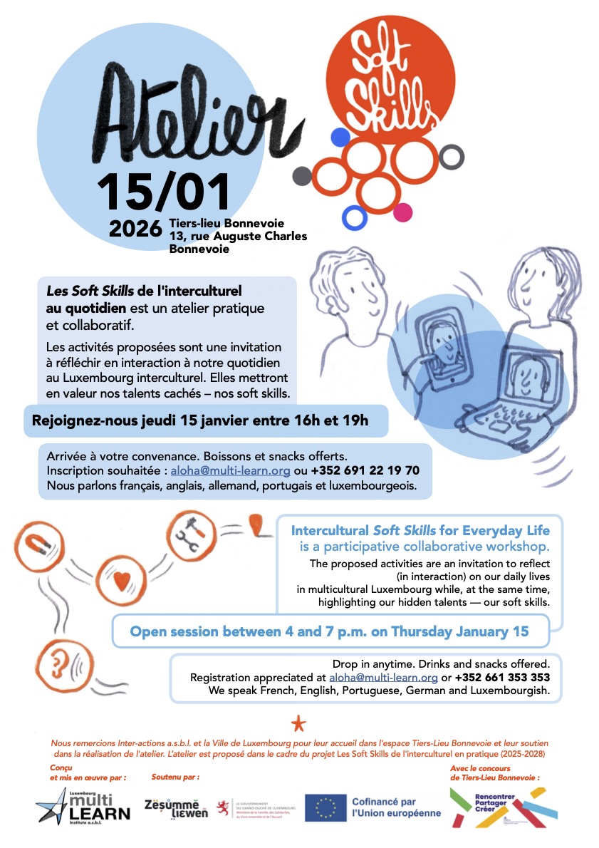 Vous ĂŞtes les bienvenus au prochain atelier SOFT SKILLS du 15 janvier 2026 au Tiers Lieu de Bonnevoie entre 16h et 19h!