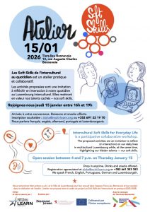 Vous ĂŞtes les bienvenus au prochain atelier SOFT SKILLS du 15 janvier 2026 au Tiers Lieu de Bonnevoie entre 16h et 19h! * Le projet « Les soft skills de l’interculturel en pratique » a pour ambition de proposer un (par)cours du vivre-ensemble en 12 modules ou chapitres. Grâce aux contributions de ceux et celles Ă qui ce (par)cours est plus particulièrement destinĂ©, les ReprĂ©sentants des Pays Tiers et les Multiplicateurs, il revisite les diffĂ©rentes facettes du vivre-ensemble interculturel (citoyennetĂ©,…
